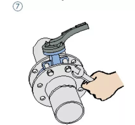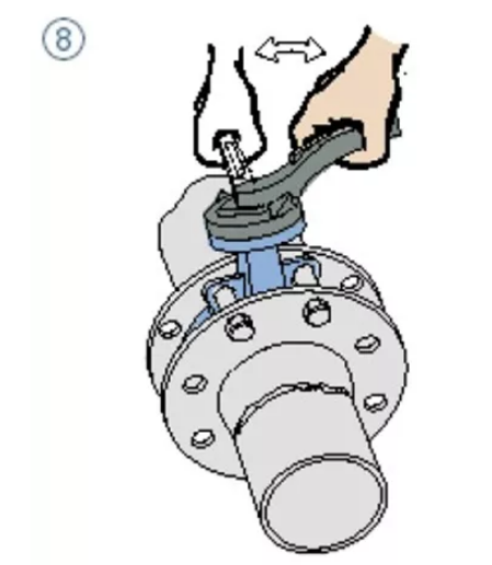 7、校正阀门位置并将四对螺栓拧紧,(注意不要拧得过紧)