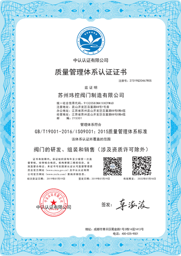 公司高层得力领导及各部门积极配合下,经过中认认证公司专家的全面、严格、细致的指导和审核,确认我公司质量管理体系符合ISO9001:2015质量体系标准的要求,昆山立信隆流体附属公司苏州玮控阀门制造有限公司的阀门的研发、组装和销售以及一 些特殊行业定制产品的设计与制造过程中均能严格按照ISO9001:2015的标准执行。