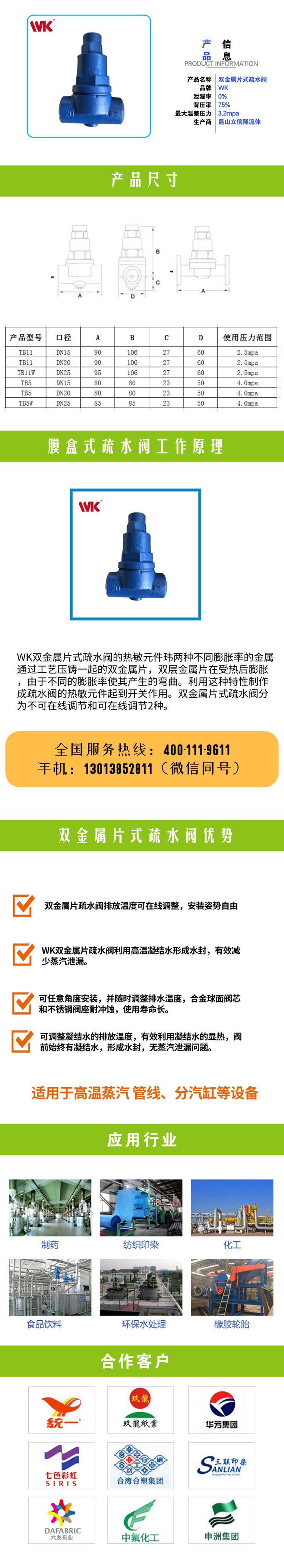 WK双金属片式疏水阀的热敏元件玮两种不同膨胀率的金属通过工艺压铸一起的双金属片,双层金属片在受热后膨胀,由于不同的膨胀率使其产生的弯曲。利用这种特性制作成疏水阀的热敏元件起到开关作用。双金属片式疏水阀分为不可在线调节和可在线调节2种。